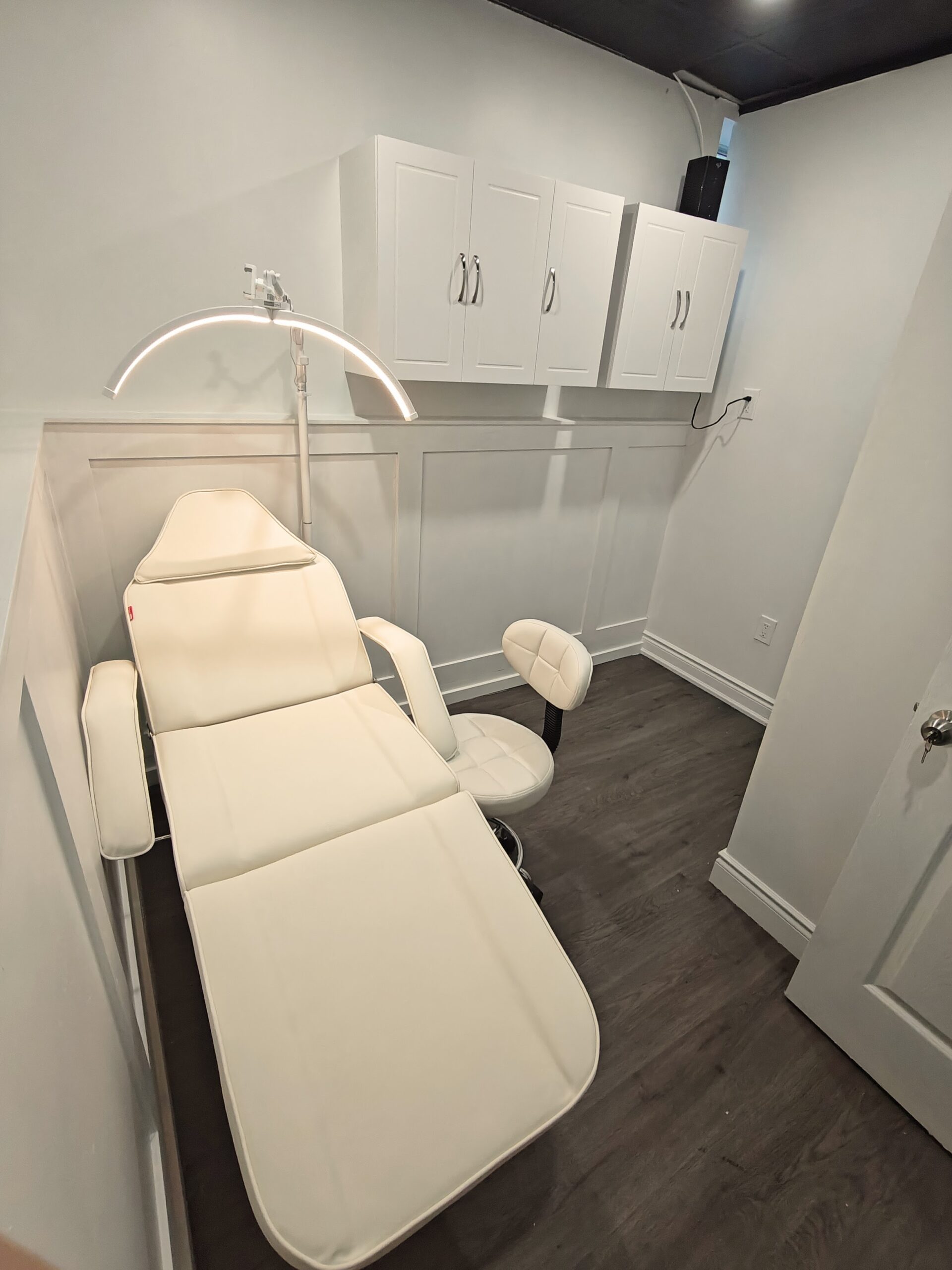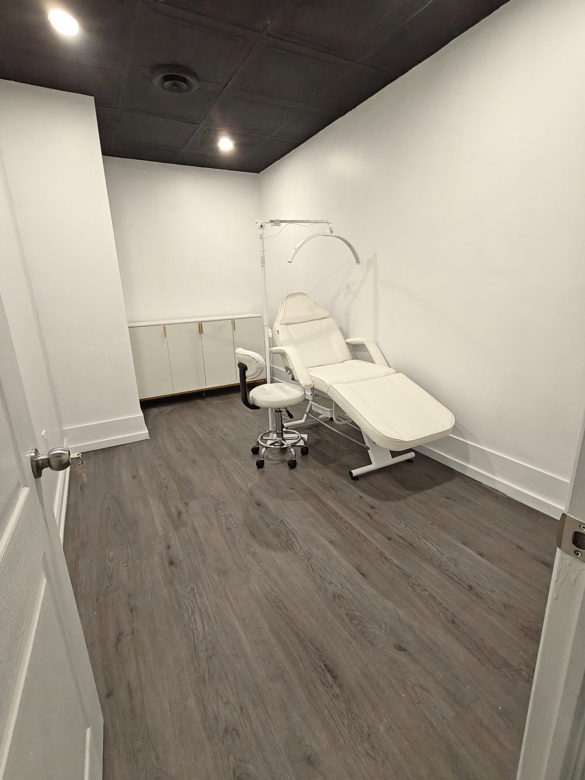 ☑️ Clean, move-in-ready private suite with counter space, cabinetry, salon bed, LED lamp and more